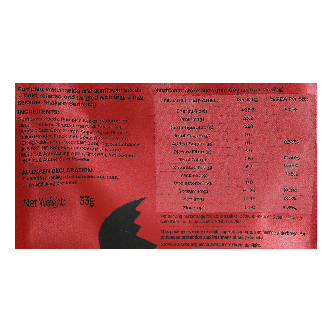 Sunflower seeds, pumpkin seeds, watermelon seeds, and sesame seeds - all roasted, tangled, and thrown together in a lime chilli mashup that doesn’t know when to quit. This mix is a full-blown flavour party gone sideways: tangy lime crashing in, chilli kicking up the volume, seeds dancing on your tongue without a care for the chaos cops.